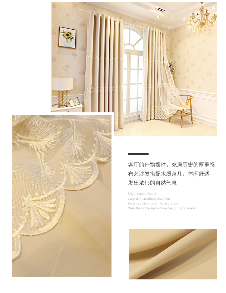 TURBOUNシンプルなバラの刺繍窓の紗の純色の遮光寝室のリビングルームの窓のカーテンのベージュ色+バラ糸【穴あけ加工】1.5幅2.7の高さは一つです。高さを変えられます。(メモの高さ)