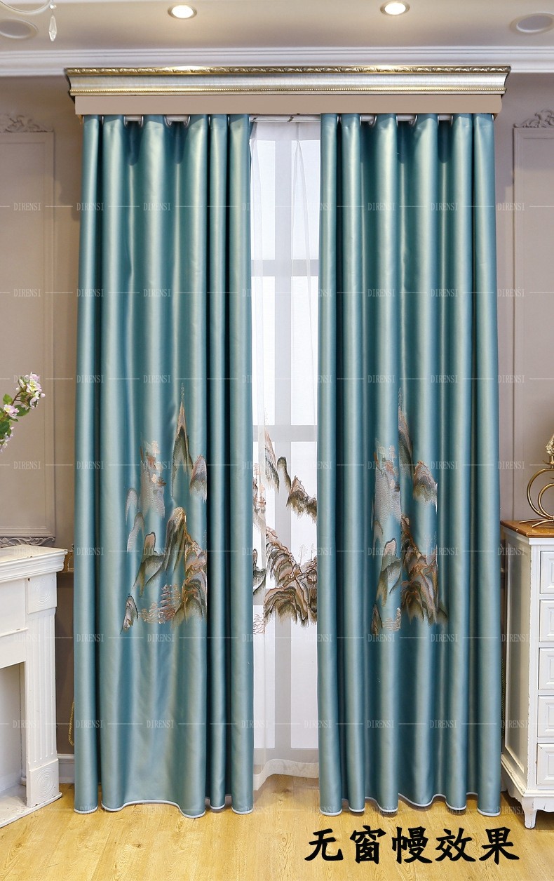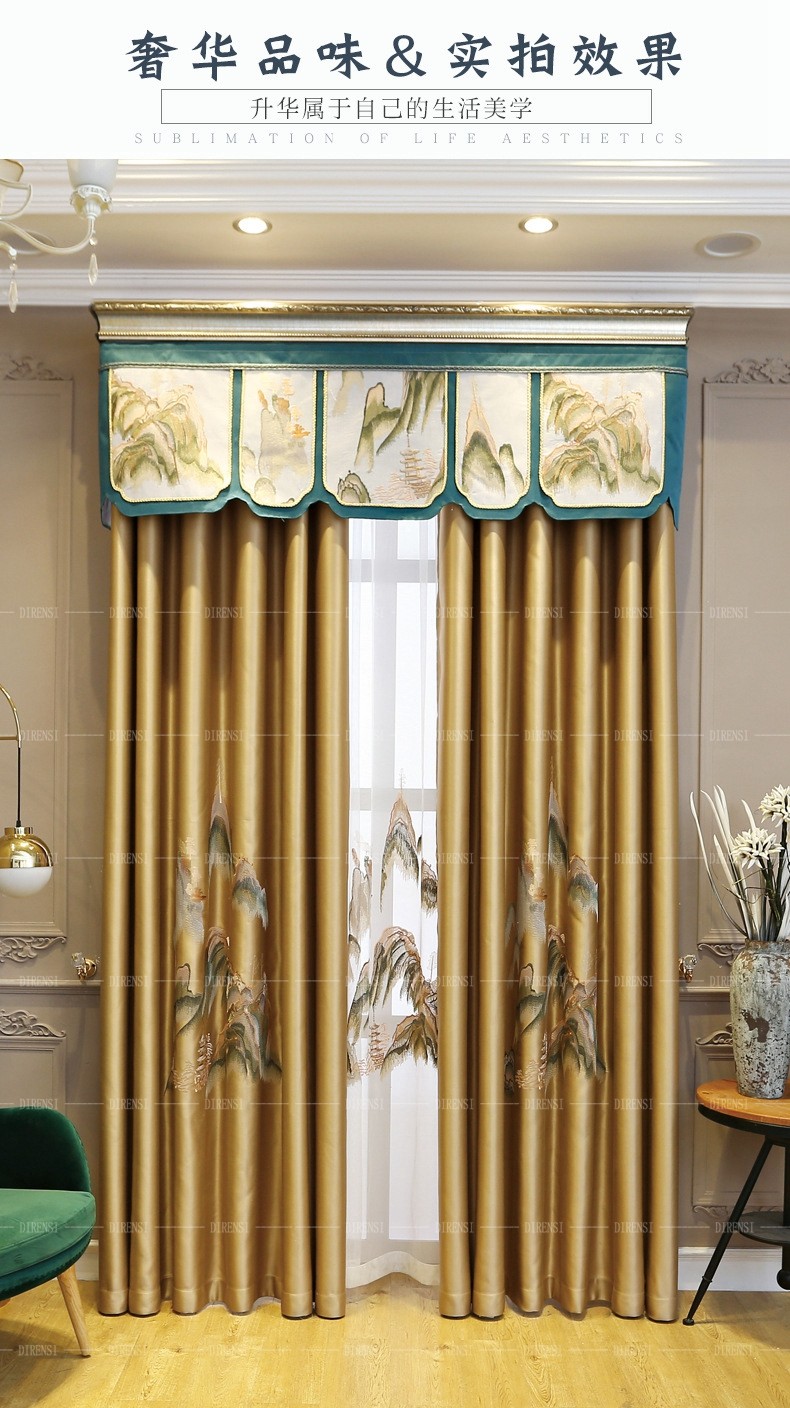 黛恩糸中国式のカーテンは高精密なシミュレーション糸山水をカスタマイズしました。中国風の新中国式の古典刺繍リビングルームの書斎の遮光布のカーテンをカスタマイズしました。カレー色の布は幅が5.2メートルで、6.5メートルです。8.0メートルです。